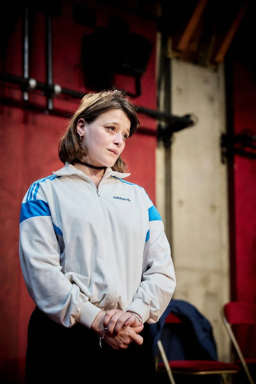 Je dirais que le personnage d’Adeline était le plus complexe. Il fallait traduire plusieurs facettes : un milieu de banlieue, une forme de féminité un peu enfantine, mais aussi le fait qu’elle se prostitue. L'idée de la jupe m’est venue en observant Adeline elle-même. Elle arrivait souvent en jupe aux répétitions. Le sweat Adidas et la casquette viennent casser ce côté "corporate" de la jupe. C'est une silhouette très moderne, très actuelle, qui permet aux personnages de se fondre dans la salle au début de la pièce sans être remarqués.